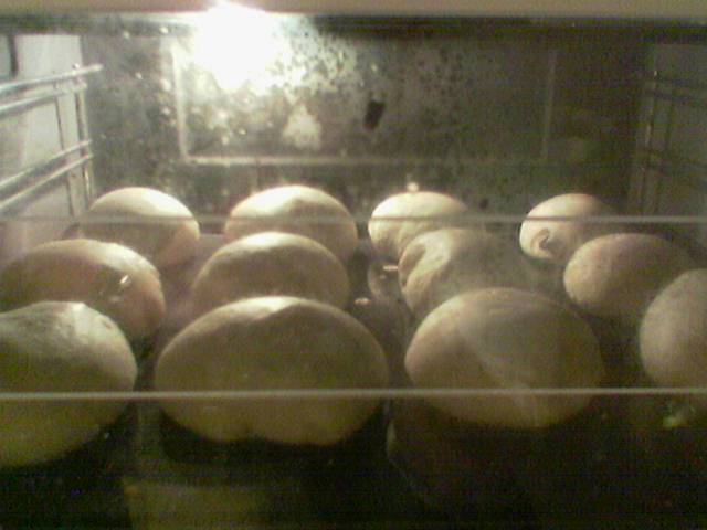 5 kg hvetemel 3 liter melk 600 g sukker 7 pk. gjær 8 egg 1 kg margarin kardemomme rosiner (evt. smør, kanel og sukker) 200 grader i ca 10 min. Vi brukte 1/4 oppskrift 1.25kg mel 0.75l melk 150g sukker 2pk gjør 2 egg 250g smør kardemomme rosiner Sånn gjorde vi: Sett på ovnen. Smelt smør. Ha i melk, sjekk temp (skal være som en god og varm dusj). Rør ut gjær. Bland i sukker, egg, mel/kardemomme. Den virker som det er for lite mel, men den skal være litt klissete. Hev i ca 1 time under håndkle til ca dobbel størelse. Elt ut litt. Del opp og ha i rosiner og sett på plate. Etterhev til ca dobbel str. (max 30min) Pensle med melk. Vi måtte steke mer enn de oppgitte 10 min. Mulig ovnen vår er litt rar. Det ble 36 boller. Noen av dem ble ganske store når vi gadd å etterheve dem nok. |