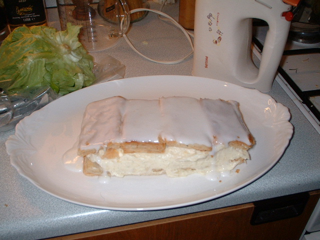 - Kok opp 5dl melk - Ha i en splittet vanlijestang med innmaten skrapt ut - bland i en bolle 4 eggeplommer, 100g sukker og 35g maizena - ha litt kokende melk i blandingen, rør rundt og ha alt tilbake i kjelen. Kok til det er blitt tykkt. - ta ut vaniljestang og sett på verandaen til å bli kaldt Kjevle ut noen tinte butterdeigplater tynt og prikk dem med en gaffel så de ikke klarer å heve. Stek på ca 225 grader til de har passe farge. Hvis de ehve må de klemmes sammen igjen før de er kalde. La de kjøles. Pisk krem av 2.5dl fløte. Bland i vaniljekremen og 1ts rom (evt dråper) Ta ett lag butterdeig, legg på et fat, ha masse vaniljekrem på, og legg så på et lokk av butterdeig opp ned, så den flate siden kommer opp. Bland melisglassur av 2dl melis og 2ts eggehvitte og evt rom, smør på kakene. Når Melisen er stiv kan den deles med en kniv. Vi jukset og delte opp den øverste platen før vi la den på. |